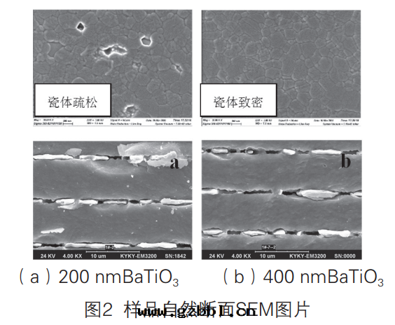 按表(biǎo)1的(de)各(gè)組要(yào)求制作(zuò)MLCC産品,因(yīn)为(wèi)颗粒(lì)大(dà)小不(bù)同(tóng),燒結成(chéng)瓷的(de)温(wēn)度(dù)有(yǒu)一(yī)定(dìng)的(de)差异(yì),其(qí)他(tā)工藝基本(běn)相同(tóng)。一(yī)般来(lái)说(shuō),粉體(tǐ)粒(lì)徑越小,其(qí)表(biǎo)面(miàn)活性(xìng)越大(dà),燒結越容易進(jìn)行,燒結温(wēn)度(dù)較低(dī)。在(zài)使用(yòng)相同(tóng)改性(xìng)添加劑(Dopant)情(qíng)況下(xià),对(duì)表(biǎo)1中(zhōng)不(bù)同(tóng)粒(lì)徑的(de)BaTiO3粉體(tǐ)分(fēn)别制定(dìng)合适的(de)燒結温(wēn)度(dù),以(yǐ)保證瓷體(tǐ)致(zhì)密,並(bìng)且瓷體(tǐ)晶粒(lì)生(shēng)长(cháng)均勻(如(rú)图(tú)2所(suǒ)示)。