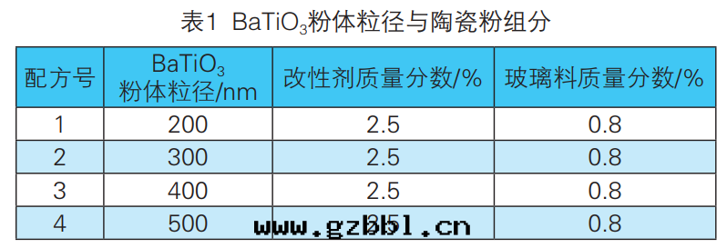 采用(yòng)水(shuǐ)热(rè)法(fǎ)制備不(bù)同(tóng)粒(lì)徑的(de)BaTiO3粉體(tǐ)(純度(dù)大(dà)于(yú)99.9%,Ba与Ti摩爾比为(wèi)0.998~1.000,晶胞參數c/a大(dà)于(yú)1.002),分(fēn)别按相同(tóng)比例与改性(xìng)化(huà)合物(wù)進(jìn)行混合,得到(dào)不(bù)同(tóng)粒(lì)徑的(de)瓷粉,不(bù)同(tóng)粒(lì)度(dù)BaTiO3的(de)各(gè)陶瓷粉組成(chéng)見(jiàn)表(biǎo)1。